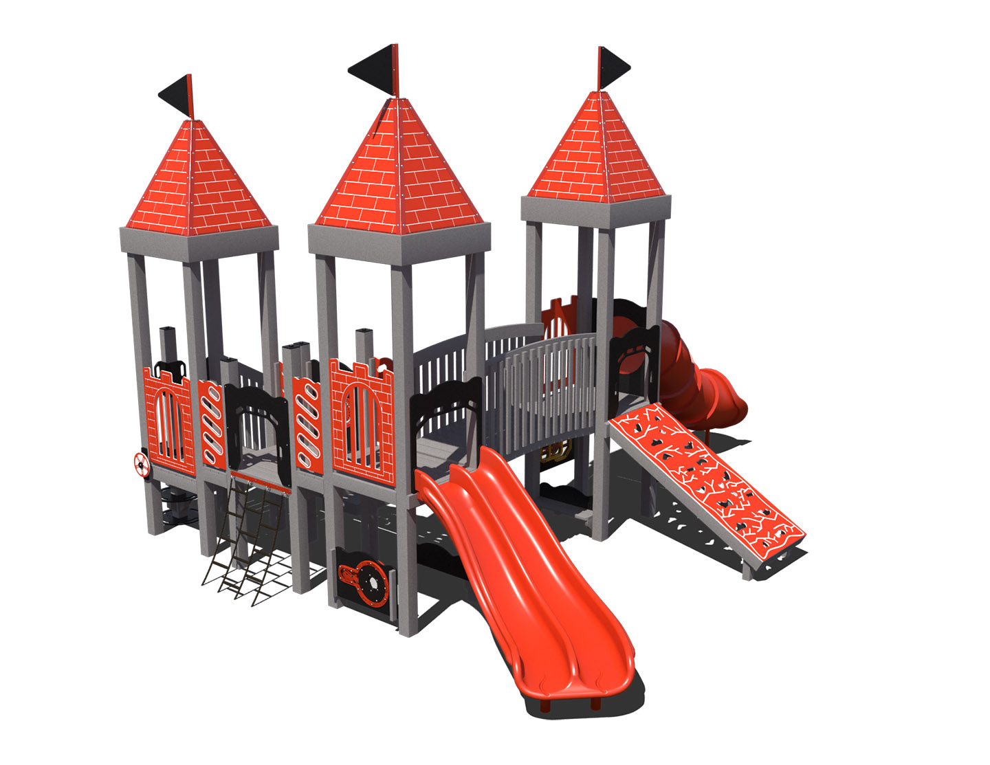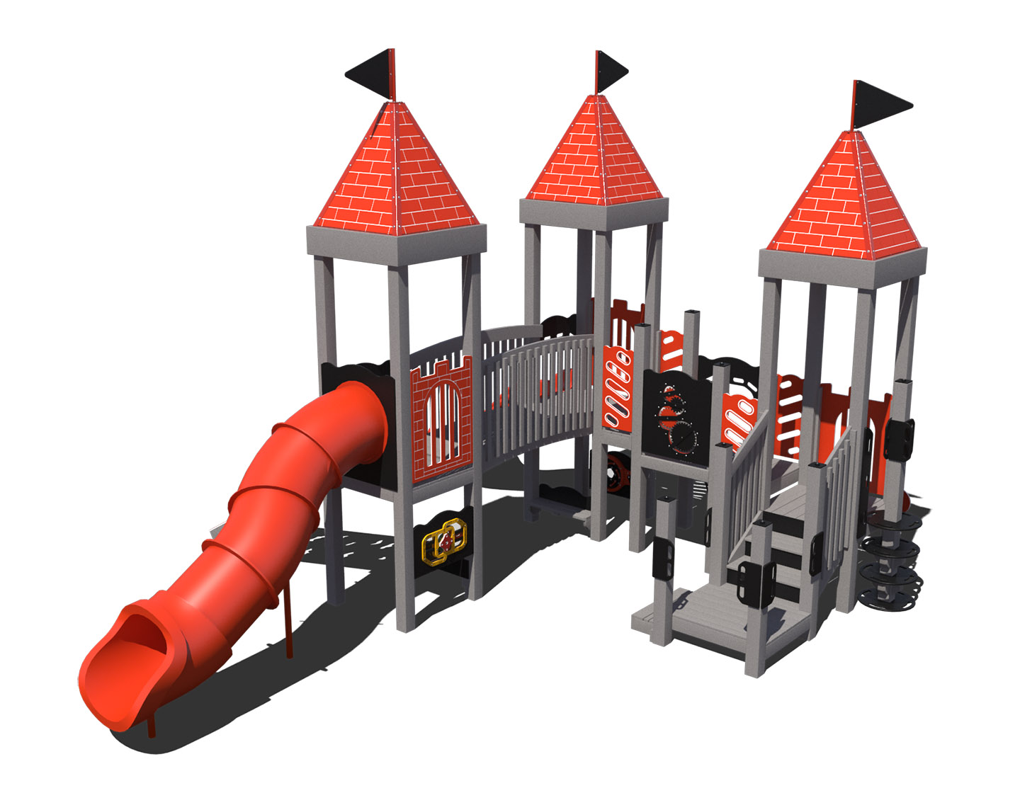 Let young adventurers rule their own kingdom with our castle-themed playground, perfect for children ages 2-12 years. Designed to accommodate 30-35 kids at once, this engaging 29’x26’ structure features towering turrets, bridges, slides, and climbing elements that encourage creative play and physical activity. With a spacious 41’x38’ use zone and a 5’ fall height, this playground prioritizes both fun and safety. Whether scaling the castle walls, crossing the drawbridge, or escaping down the slides, children will enjoy hours of imaginative and active play in their very own medieval fortress.