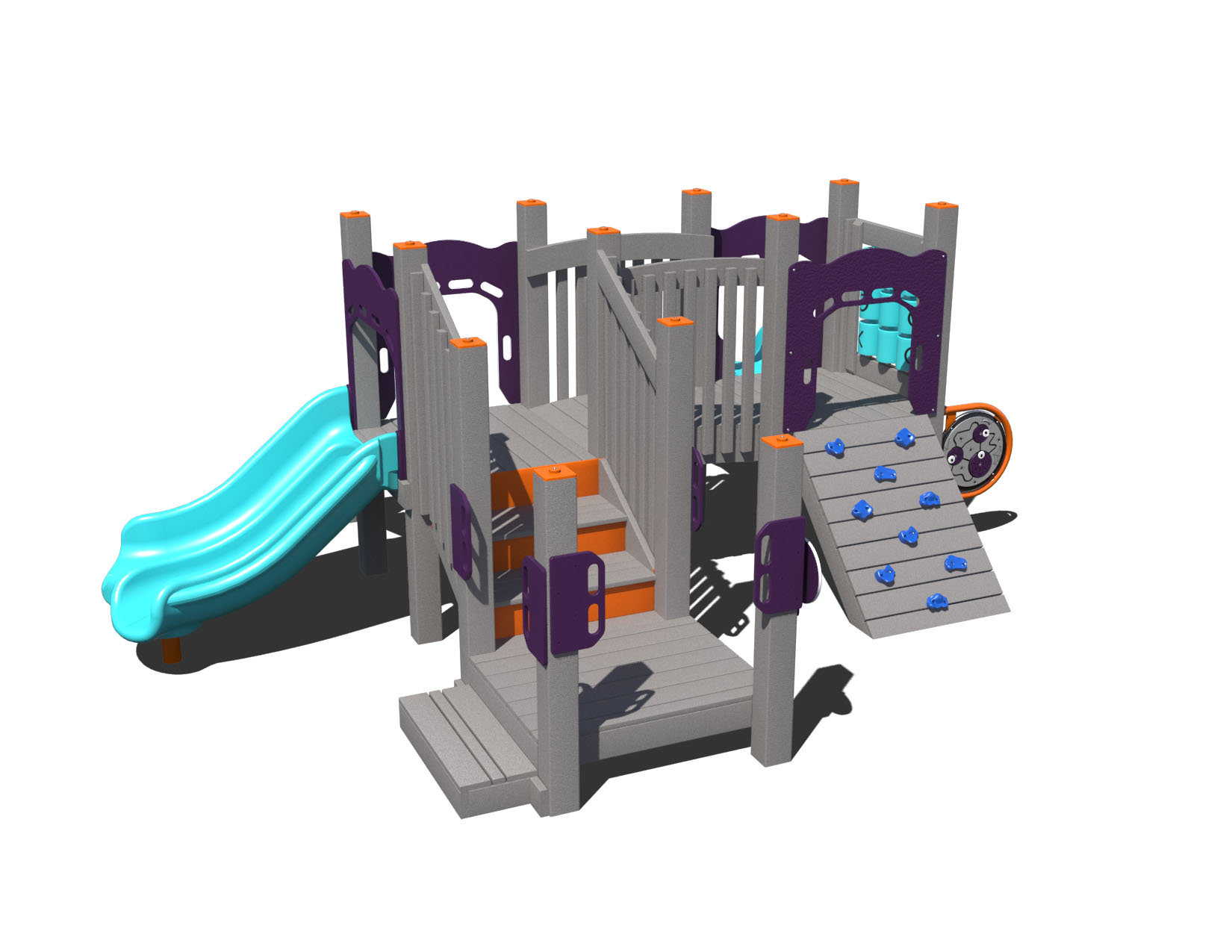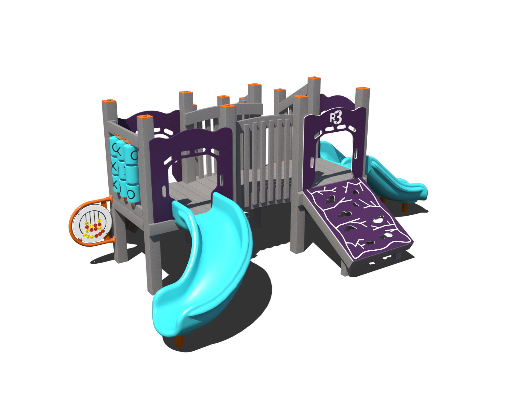This small playground for children ages 2-5 years is great for child cares, preschools, and more. It's compact size make it a great choice for smaller spaces. This playground includes two slides, including a slide with a double bedway. It includes to inclined climbers, the Rockin' Ramp and Ramp Climber with Rock Grips, to provide easier climbing challenges for younger users. Additionally, it includes three activity panels.